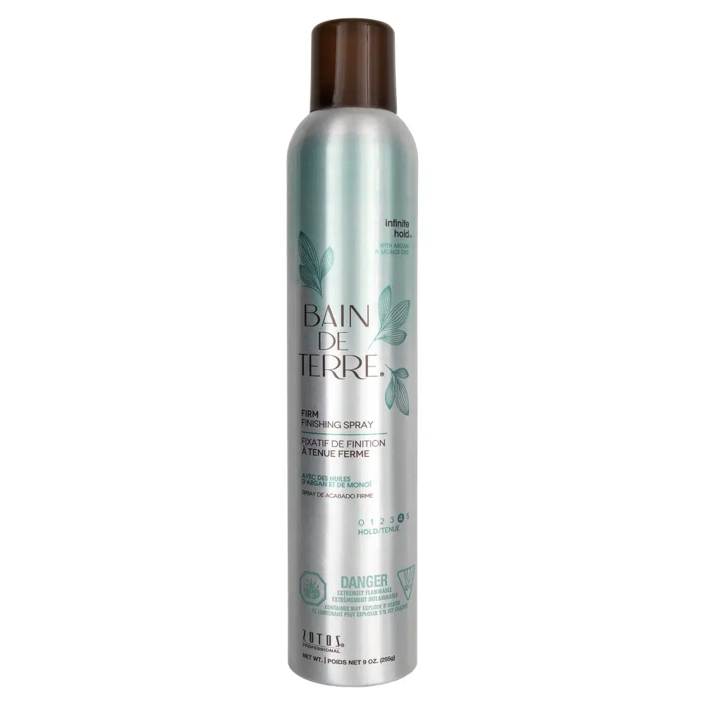 The Bain de Terre Infinite Hold Firm Finishing Spray provides maximum hold and brilliant shine for long-lasting style. Flax seed's natural starching and bodifying properties provide firm styling support while protecting hair against humidity. In addition to Flax Seed, the Bain de Terre Infinite Hold Firm Finishing Spray is infused with argan and monoi oils to lavish the hair while it protects from humidity and thermal styling tools up to 450 degrees Fahrenheit. This spray will never leave behind any stickiness or flake and dries on the hair quickly while providing incredible shine to the hair. 55% VOC formula.