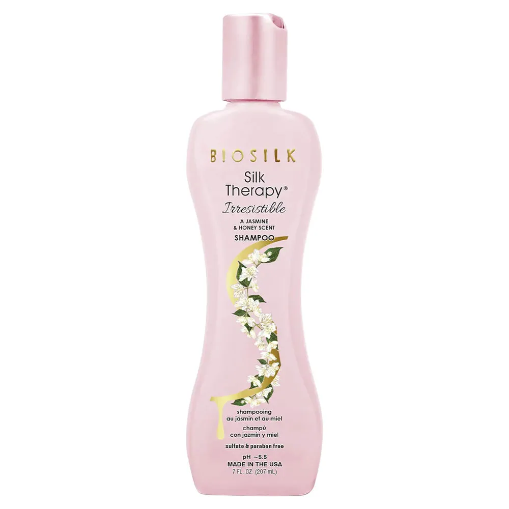 Replenish the moisture in your hair with the BioSilk Silk Therapy Irresistible Shampoo. Enriched with botanical extracts and herbs to cleanse and remove build up while leaving hair healthy and manageable. Silk proteins penetrate hair to condition and create incredible shine . Ideal for all hair types. Featuring scent notes of Sheer Jasmine petals with sweet Honey and notes of Dewberry, Vanilla, Patchouli and Pink Rose.