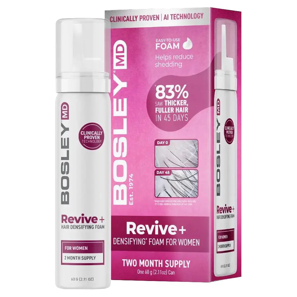 Get fuller and thicker-looking hair strands in as little as 45 days with the BosleyMD Revive+ Hair Densifying Foam for Women.