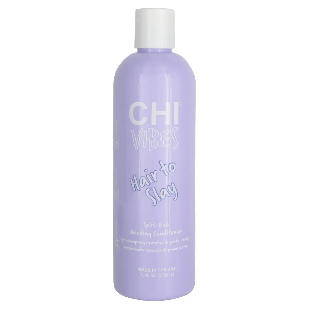 Repair and mend split ends in your hair with the CHI Vibes Hair to Slay Split End Mending Conditioner. Formulated with split-end mending bonders that help repair the damage to hair from heat styling, bleaching, coloring, and everyday brushing. Formulated with hair-loving ingredients like Squalene, Carob Tree Seed Extract, and Avocado Oil to help heal hair, prevent breakage and further damage, improve the integrity of your hair, smooths and seals the hairs cuticle, and provide intense moisture.