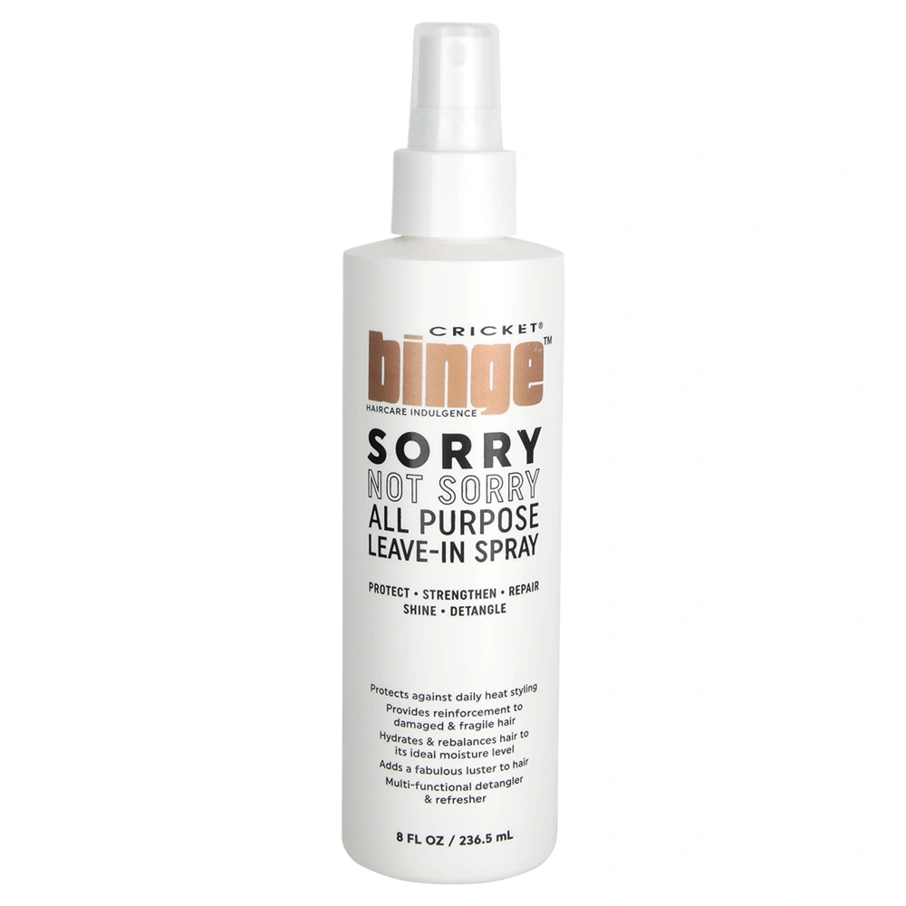 Protect your hair from harmful heat damage with the Cricket Binge - Sorry Not Sorry All Purpose Leave-In Spray. Designed to reinforce, strengthen and help seal the cuticle of your hair before heat styling, this weightless spray does it all. Instantly adapting to all hair types and textures, this leave-in helps repair damage and re-moisturize hair.
