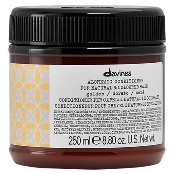 Transform your blonde locks with the Davines Alchemic Golden Conditioner, designed to intensify and illuminate natural and color-treated golden to honey blonde shades. This color-depositing conditioner uses pure pigments to add a rich, sun-kissed warmth, reviving and enhancing your hair's natural radiance. Infused with jojoba oil, it provides intense hydration, softness, and shine, while also improving combability for smoother, more manageable hair. Free from silicones and parabens, the Alchemic Golden Conditioner is the perfect solution for blondes seeking to add warmth and depth to their color.