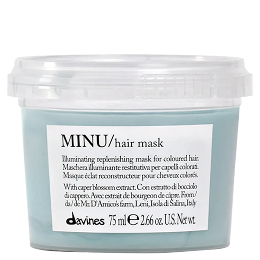 The Davines Minu/ Hair Mask is an illuminating, protecting, and hydrating hair mask that is formulated for those with color-treated hair types. This hair mask helps to deeply nourish color-treated hair and leave every hair strand soft and silky, while additionally helping to extend hair color vibrancy. The Davines Minu/ Hair Mask is lightweight and ideal for all hair types and textures. This hair mask is infused with caper blossom extract that is sourced from Mr. Salvatore D’Amico’s farm on Salina Island, Messina, Italy, as a part of Slow Food Presidia. This extract is a good source of quercetin (a protective amino acid), as well as color-protecting polyphenols. The Davines Minu/ Hair Mask provides color-treated hair strands with the extra hydration and nourishment they need to remain healthy, bright, and full of life.