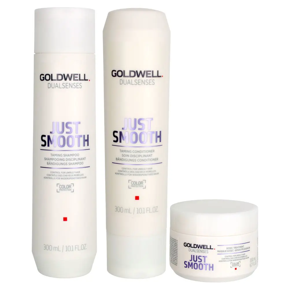 Just Smooth Taming Shampoo: Water / Aqua / Eau, Sodium Laureth Sulfate, Sodium Lauroyl Sarcosinate, Sodium Chloride, Lauryl Hydroxysultaine, PEG-3 Distearate, Amodimethicone, Aleurites Moluccana Seed Oil, Octyldodecyl PCA, Sodium PCA, Willow Bark Extract, Ethylhexylglycerin, Polyquaternium- 10, Lactic Acid, PEG-150 Pentaerythrityl Tetrastearate, PPG-2 Hydroxyethyl Cocamide, Panthenol, Glycerin, C12-14 Pareth-12, Glycyl Glycine, Butylene Glycol, Citric Acid, PPG-9, Sodium Acetate, Isopropyl Alcohol, C11-15 Pareth-7, Laureth-9, Glycoproteins, Trideceth-12, Acetic Acid, Sodium Benzoate, Benzoic Acid, Phenoxyethanol, Fragrance / Parfum, Linalool, Hexyl Cinnamal, Geraniol.