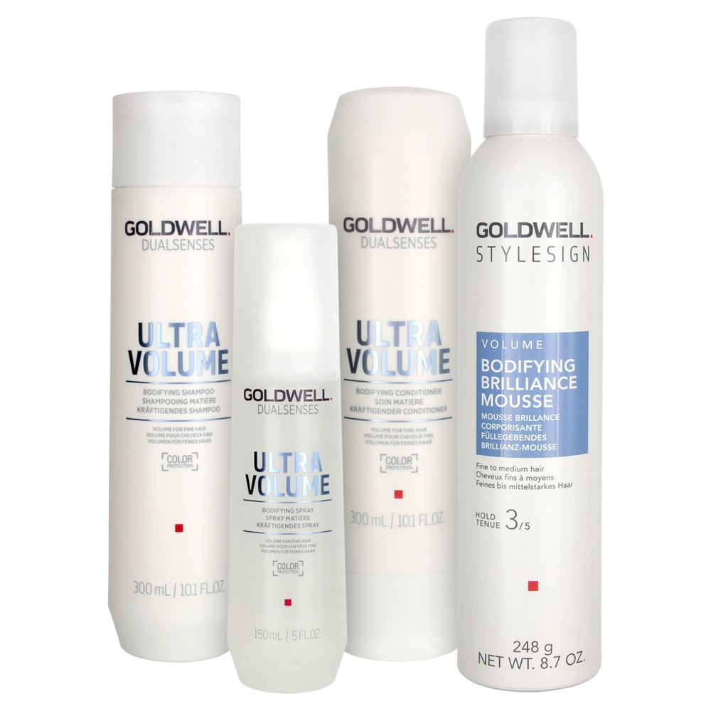 The Dualsenses Ultra Volume Bodifying Shampoo and Conditioner is an ultra-lightweight shampoo and conditioner that leaves each hair strand with luscious bounce and shine. The Goldwell Dualsenses Ultra Volume Bodifying Shampoo is blended with microPROtec complex, rice protein, and FadeStop Formula. These key ingredients and complex make this shampoo extremely gentle on hair color and prolong the life and vibrancy of your hair color. The inclusion of rice proteins strengthens each hair strand to create touchable volume in fine and limp hair textures. The Goldwell Dualsenses Ultra Volume Bodifying Conditioner uses a Volume System with Multi-Minerals combined with the Instant Microfluid Technology to create an ultra-light-weight gel texture that strengthens the hair and provides visibly enhanced volume and the feeling of having ''more'' hair.