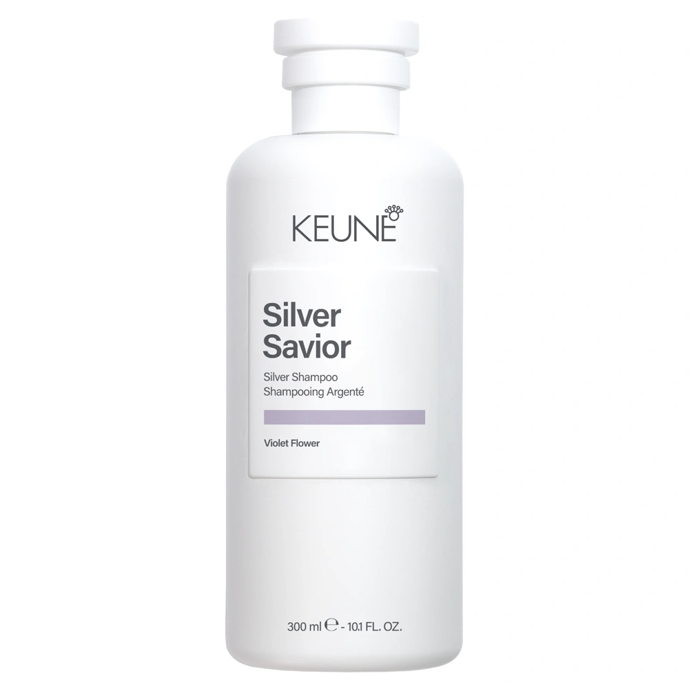 The Keune Silver Savior Silver Shampoo is a violet-based neutralizing shampoo that is expertly formulated to cleanse hair, while correcting yellow and warm undertones. This toning shampoo is ideal for those with cool blonde, silver, or platinum hair and harnesses the power of violet pigments and nourishing ingredients. The Keune Silver Savior Silver Shampoo is infused with Bond Fuser Technology and Violet Flower. Violet Flower is naturally rich in color-protecting pigments and helps to counteract yellow and brassy tones. This helps to leave hair bright, cool, and true to tone. This flower additionally provides hair with lightweight hydration to keep strands soft and manageable. Keune's Bond Fuser Technology works at the molecular level to reinforce the hair's internal structure, repair damage, restore strength, and leave hair strong and incredibly resilient. The Keune Silver Savior Silver Shampoo leaves hair clean, cool-toned, and luminous, without drying or dulling the hair. This shampoo features an azure sky fragrance of clean and uplifting cucumber, apple, grapefruit, soft floral notes, as well as sandalwood and amber.