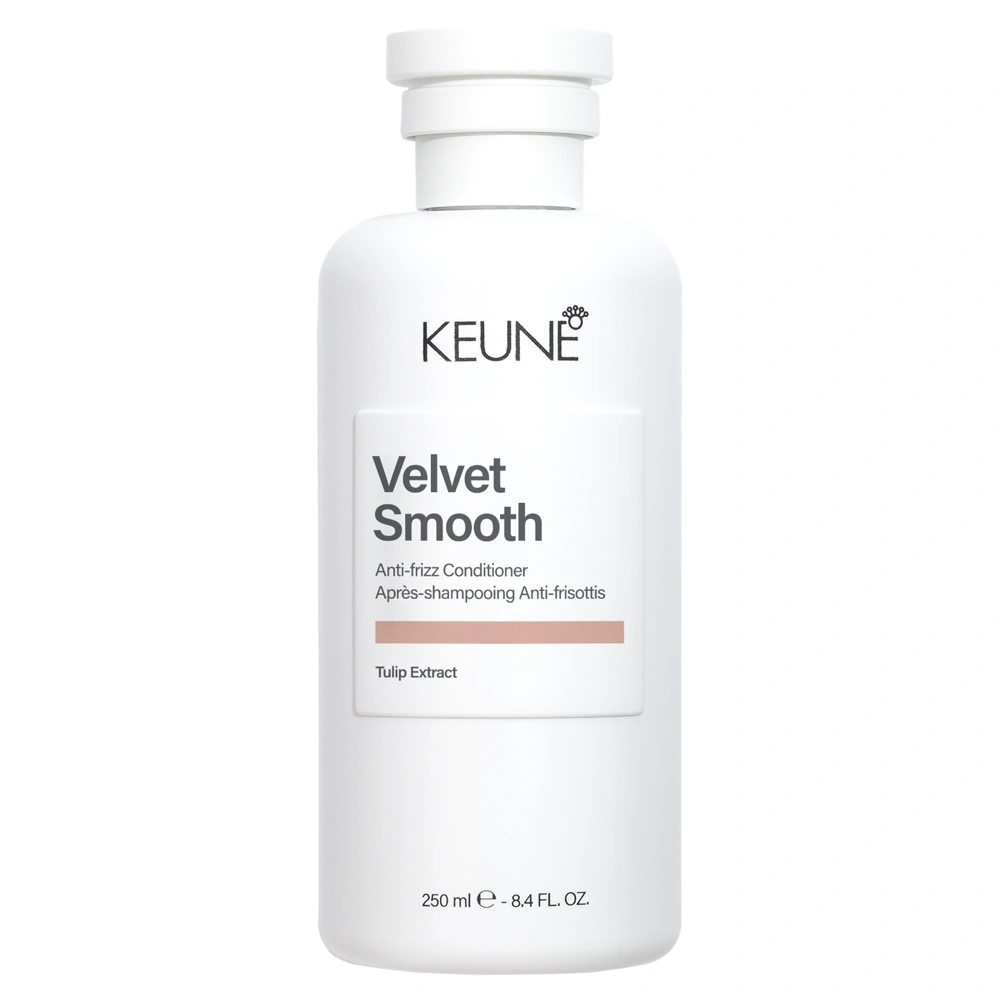 The Keune Velvet Smooth Anti-frizz Conditioner is a hydrating, detangling, and frizz-taming conditioner that deeply nourishes the hair's cuticle. This conditioner's formula helps to seal the hair's cuticle to create sleek and more manageable hair strands with each use. The Keune Velvet Smooth Anti-frizz Conditioner instantly smooths and softens the hair, and is infused with Biomimetic Lipids and Tulip Extract. Tulip Extract is a botanical ingredient that is known for its hydrating and smoothing properties. This extract is rich in natural antioxidants and moisture-binding compounds that help to calm frizz, seal the hair's cuticle, and protect strands from humidity. Tulip Extract deeply nourishes each hair strand and ensures hair remains silky and touchably soft, even in challenging weather conditions. The Biomimetic Lipids in the Keune Velvet Smooth Anti-frizz Conditioner provide essential reinforcement to the hair's natural barrier. These lipids mimic the structure of the hair's own protective layer, helping to restore moisture balance, strengthen the cuticle, and create a sleek and frizz-resistant finish. The Biomimetic Lipids smooth the hair and enhance strands' resilience, preventing future frizz and flyaways. The Keune Velvet Smooth Anti-frizz Conditioner leaves hair hydrated, smooth, sleek, and with a florum fragrance of spiced florals and pink pepper, followed by white florals, musk, and cedarwood.