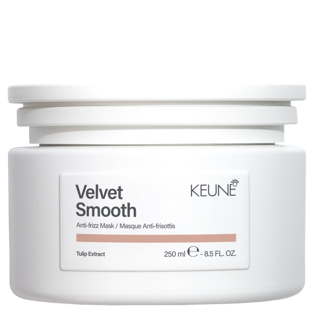 The Keune Velvet Smooth Anti-frizz Mask is a rich, nourishing, and hydrating treatment that is designed to repair and control frizz-prone styles. This mask's clinically proven formula seals the hair's cuticle to restore softness and leave hair sleek, silky, and incredibly manageable, providing results that last. The Keune Velvet Smooth Anti-frizz Mask is infused with Biomimetic Lipids and Tulip Extract. Biomimetic Lipids help to reinforce the hair's natural barrier and mimic the structure of the hair's own protective layer. Lipids restore the hair's moisture balance, strengthen the hair's cuticle, and create a sleek and frizz-resistant finish. Biomimetic Lipids enhance the hair's resilience to prevent future frizz and flyaways. Tulip Extract is a botanical powerhouse that is rich in antioxidants and moisture-binding compounds. These help to calm frizz and seal the hair's cuticle to defend against style-ruining humidity. This extract deeply nourishes each and every hair strand, ensuring the hair remains silky and touchably soft in all weather conditions. The Keune Velvet Smooth Anti-frizz Mask is the perfect solution for frizz-prone hair and leaves strands with a florum fragrance of spiced floral and pink pepper, with notes of white florals, musk, and cedarwood.