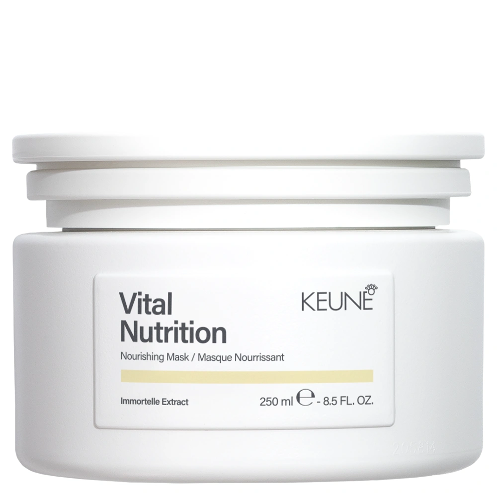 The Keune Vital Nutrition Nourishing Mask is a transformative hair mask that is ideal for those with dry, tired, and damaged hair strands. This nourishing mask provides hair with incredible hydration and nourishment, helping to repair hair and restore softness. The Keune Vital Nutrition Nourishing Mask delivers a surge of moisture and is infused with Biomimetic Ceramides and Immortelle Extract. This hair mask uses Biomimetic Ceramides, a lab-created lipid that is designed to mimic your hair's natural lipids to repair the cuticle and lock in moisture. This helps to fight dryness and frizz and additionally strengthens the hair. Ceramides also protect against heat and styling damage and create smoother, softer, shinier, and more resilient hair. Immortelle Extract is a powerful antioxidant with incredible regenerative properties. This extract strengthens hair and combats damage while protecting strands from oxidative stress, creating shinier and softer hair. The Keune Vital Nutrition Nourishing Mask revitalizes hair and shields strands from external aggressors to reveal overall healthier hair with each use. Lastly, this hair mask features a santal spectrum fragrance with a warm, woody-floral blend of mandarin, jasmine, nutmeg, and sandalwood.