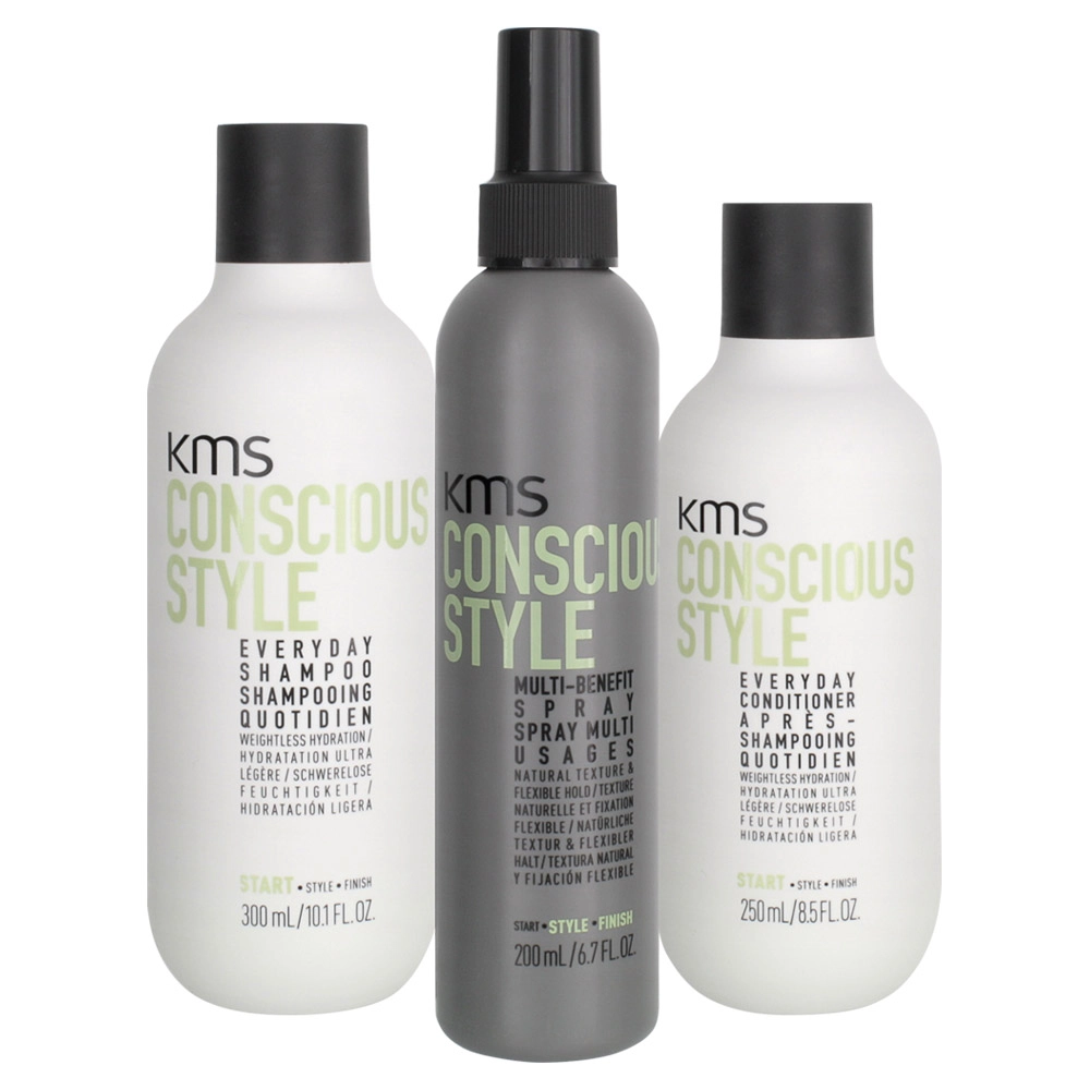 Gently cleanse, condition, and enhance each hair strand and wrap it in weightless hydration with the KMS Conscious Style Trio. This hair-enhancing trio is designed to provide ultra-lightweight moisture and softness to each hair strand while the Conscious Style Multi-Benefit Spray provides lightweight hold, hydration, elasticity, and heat protection.