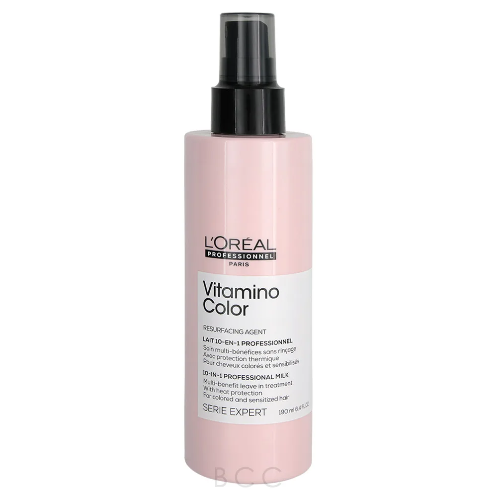 The L'Oréal Professionnel Serie Expert Vitamino Color 10-in-1 Professional Milk is a leave-in treatment that creates a lasting barrier against frizz and heat damage. With this leave-in, hair will be left with a lightweight condition, outstanding manageability, and intense smoothness and it will even out porous hair. L'Oréal Professionnel Serie Expert Vitamino Color 10-in-1 Professional Milk replaces lost nutrients in your hair to restore healthy hair. This leave-in is infused with Resveratrol, a powerful antioxidant present in the skin and seeds of grapes that help preserve hair color. In addition to color preservation, the L'Oréal Professionnel Serie Expert Vitamino Color 10-in-1 Professional Milk provides the hair with thermal protection, prevents breakage, reduces frizz, and enhances shine and softness.