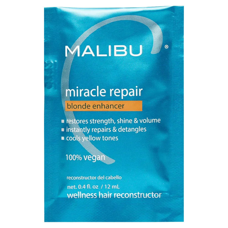 Provide immediate repair and tone your blonde in one shot with the Malibu C Miracle Repair - Blonde Enhancer. This 100% vegan formula is packed with proteins and antioxidants to repair your damaged blonde hair. Finding weak spots within each hair strand, this mask fills that weak spot and rebuilds it for stronger and healthier hair. This ultra-pigmented formula enhances blonde tones and reduces brassiness and discoloration.