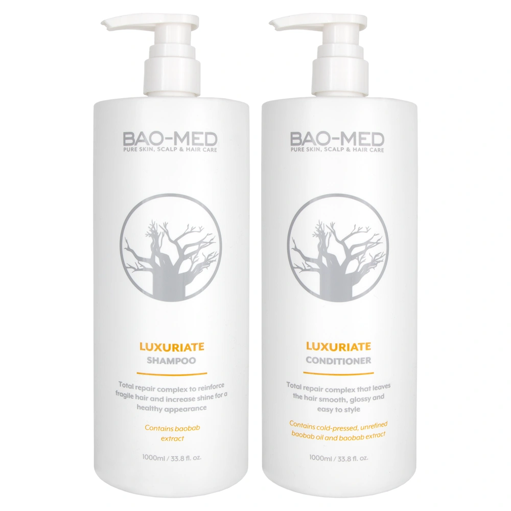 The BAO-MED Luxuriate Shampoo & Conditioner Set is designed to provide your dry and damaged hair strands with intense care. This duo is enriched with vitamins, minerals, and proteins that help to strengthen, hydrate, and protect the hair for supple, healthy hair with a shiny finish. The BAO-MED Luxuriate Shampoo uses cold-pressed oils and sustainably harvested raw materials, such as Hydrolyzed Soy Protein, Baobab Seed Extract, and Rice Amino Acids. These key ingredients provide the hair with moisture, strength, and protection, while additionally helping to promote a smooth and glossy hair finish. The BAO-MED Luxuriate Conditioner uses Baobab Seed Extract and Baobab Seed Oil, which is packed with powerful antioxidants and vitamins with anti-aging properties that helps reverse the effect of environmental and UV damage. Additionally, this conditioner helps to promote hair strength, leaving your hair feeling smoother and softer with increased elasticity and decreased fizziness. The BAO-MED Luxuriate Shampoo & Conditioner Set provides a restorative effect on the hair, leaving each and every hair strand feeling silkier, softer, and healthier. This powerful duo is 100% vegan and paraben-free.