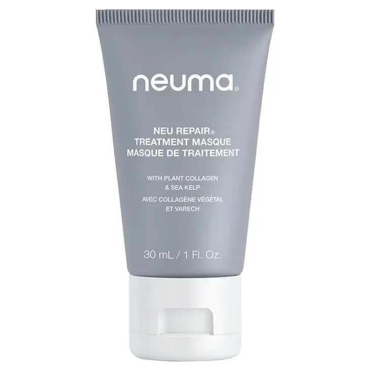 Repair hair damage and infuse nourishment deep into the hair shaft with the Neuma Neu Repair Treatment Masque. This weekly intensive treatment helps to restore hair strength, softness, and smoothness, restoring hair's health to its former glory. The Neuma Neu Repair Treatment Masque helps to deliver moisture and nourishment to the hair, helping to revive dry, brittle, and damaged hair. This masque forms a protective barrier on the hair strand to protect hair from environmental and thermal hair damage. The Neuma Neu Repair Treatment Masque provides the hair with an instant glossy shine and incredible luster and can be used on the hair weekly, or as needed! Formulated with Carob Seed Extract, Plant Collagen, and Sea Kelp to help transform hair strands. The Plant Collagen in this masque helps to increase hair elasticity by filling in missing bonds between cells, helping to instantly strengthen the hair and reduce breakage. It also helps the hair to retain essential moisture, ensuring hair stays healthy and hydrated. Sea Kelp is a nutrient and mineral-rich ingredient that provides the hair with essential nourishment and instant smoothing, while Carob Seed Extract uses amino acids and protein to bind to the hair fiber. This helps to create a protective layer around the hair strand that smooths the hair's cuticle and repairs damage. Carob Seed Extract also helps to seal and lock in hydration helping to create smoother, shinier, and more resilient hair strands. The Neuma Neu Repair Treatment Masque is formulated without gluten and is both vegan and cruelty-free.