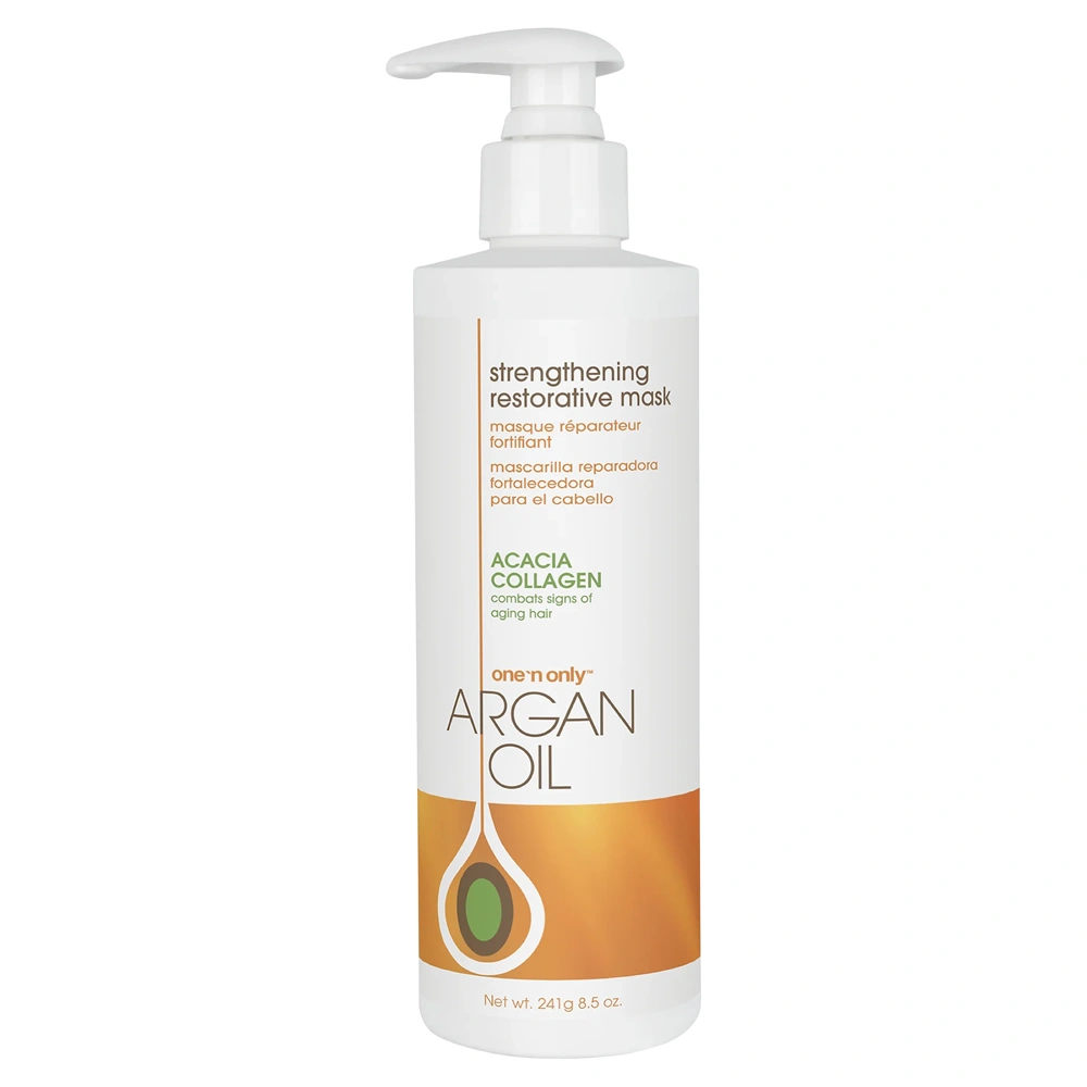 The One 'n Only Argan Oil Strengthening Restorative Mask is designed to give your damaged hair strands an instant boost of strength and hydration. This weekly treatment is the perfect addition to your haircare routine, providing hair strands with intensive conditioning and strengthening that helps to restore elasticity to damaged hair. The One 'n Only Argan Oil Strengthening Restorative Mask is infused with 100% Argan oil and acacia collagen to help repair damage, hydrate hair from within, and rebuild strength while adding texture and shine! This hair mask additionally helps to combat the visible signs of hair aging, revealing healthier, more youthful-looking strands with each use. The One 'n Only Argan Oil Strengthening Restorative Mask is cruelty-free and free from parabens, gluten, and artificial colorants.