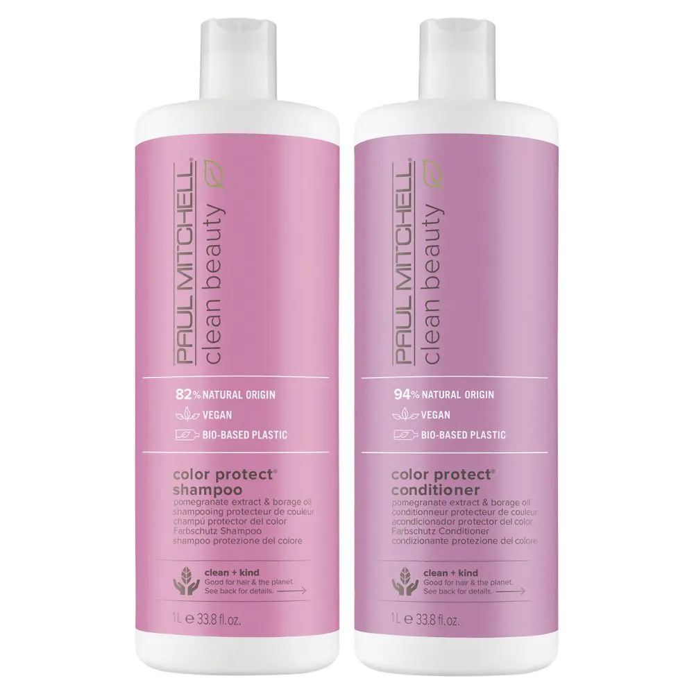 The Paul Mitchell Clean Beauty Color Protect Shampoo & Conditioner Duo is designed for those with color-treated hair and is infused with antioxidant-rich pomegranate and Borage Oil to help you maintain healthy hair and vibrant color. The Paul Mitchell Clean Beauty Color Protect Shampoo is formulated without harsh chemicals such as sulfates and parabens that tend to dull and diminish hair color. The Paul Mitchell Clean Beauty Color Protect Conditioner provides the hair with increased softness, manageability, and shine. The pomegranate extract in this duo provides hair with color protection and protection from environmental exposure and free radical damage. Additionally, pomegranate helps to strengthen the hair strand leaving it more resilient than ever. The Borage Oil adds incredible softness, manageability, and shine to the hair with each and every use. The Paul Mitchell Clean Beauty Color Protect Shampoo & Conditioner Duo is formulated without harsh chemicals like sulfates, parabens, formaldehyde, formaldehyde-releasing agents, mineral oil, coal tar, hydroquinone, and triclocarban.