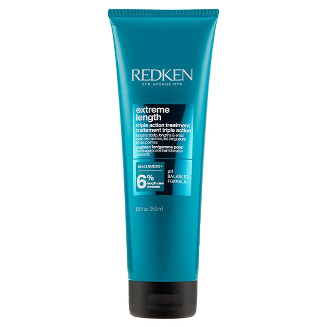 The Redken Extreme Length Triple Action Treatment is formulated with Length Care Complex, which contains biotin, niacinamide, and castor oil. This powerful combination works synergistically to provide comprehensive care for your hair. Biotin, known for its strengthening properties, helps fortify each strand from within, promoting overall hair health and resilience. Niacinamide contributes to maintaining the moisture balance of your hair, preventing excessive dryness and reducing the likelihood of split ends. Castor oil, with its rich emollient properties, deeply nourishes and seals the hair's cuticles, resulting in a smoother, sleeker appearance. Through its innovative formulation, the Redken Extreme Length Triple Action Treatment has been clinically proven to visibly reduce frayed and split ends by an impressive 68%, giving your hair a renewed vitality and a rejuvenated look. Experience the transformation as your hair becomes visibly healthier, stronger, and more manageable.