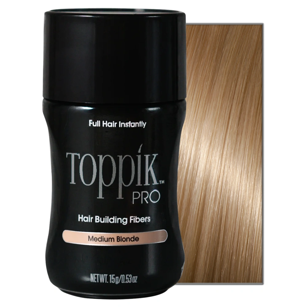 The Toppik Pro Hair Building Fibers in medium blonde are made from pure organic Keratin Protein, the same protein found in human hair, and are designed to blend seamlessly with existing hair strands. These fibers give hair a thicker, fuller appearance. They are available in a variety of different shades, matching any hair color and covering both grey roots and color-treated hair regrowth. The medium blonde option is ideal for those who have medium or dark blonde hair. The Toppik Pro Hair Building Fibers are electrostatically charged to form a magnetic attraction with your existing hair, providing a secure bond that won't budge until the hair is washed. These fibers are additionally Colorfast, meaning they won't run or rub off on clothing or your pillows. The Toppik Pro Hair Building Fibers are ideal for anyone looking to thicken up their style and conceal unwanted visible scalp.